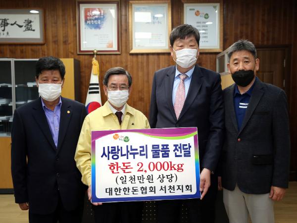 대한한돈협회 서천지회(회장 이청균)는 지난 8일 저소득층에 전해 달라며 1000만 원 상당의 돈육 2,000kg을 서천군에 기탁했다.