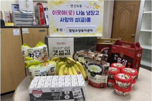 연제구 연산8동(동장 황학진)은 참빛요양복지센터(센터장 이상준)로부터 지난 9일 취약계층의 코로나19 극복을 위해 마련한 전복죽, 곰탕, 바나나, 맛김, 두유 등 10만 원 상당의 식료품을 후원받았다.