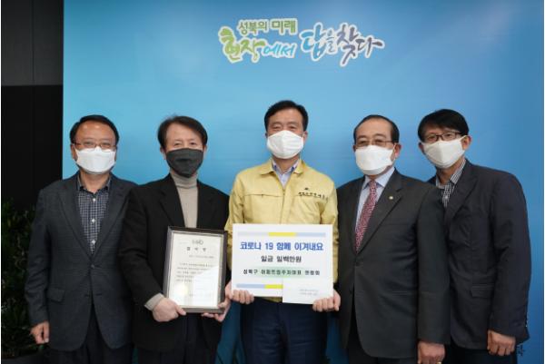 성북구 100여개 아파트의 전·현직 입주자대표회의 회장들로 구성된 성·아·연은 지난 연말 어려운 이웃을 돕기 위한 성금을 모금하였고, 기부처를 고민해 오던 중 코로나19로 어려움에 처한 이웃을 돕기 위하여 성북구청에 성금을 전달하기로 한 것이다.