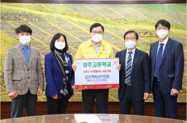 주낙영 경주시장은 “학생·학부모·교직원의 자발적 참여로 뜻을 모아 주셔서 나눔의 의미가 더욱 값지게 다가온다”며, “모범적인 나눔 사례를 보여주셔서 감사드리며 코로나19로 힘든 시기를 겪는 경주 시민 모두에게 응원의 메시지로 전해지기를 기대한다”고 전했다.
