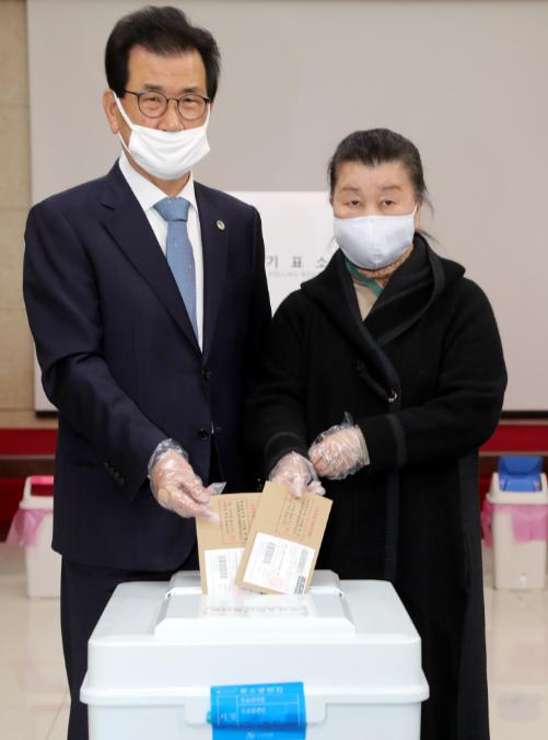 이시종 충북도지사가 10일 오전 8시 부인 김옥신 여사와 함께 처음 충북도청 대회의실에 설치된 사전투표소(사전투표소명: 성안동 사전투표소)에서 도청 직원들과 제21대 국회의원선거 사전투표를 마쳤다.
