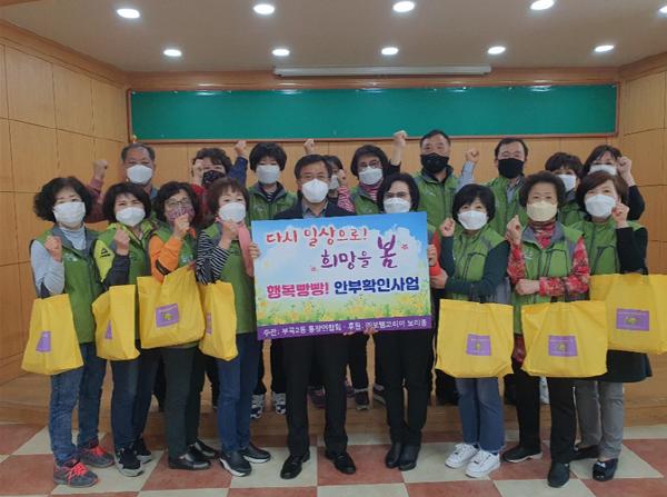 김영주 부곡2동 통장연합회장은 “코로나19 예방을 위해 마스크를 착용하고 손 소독 후 집 밖에서 짧게 안부를 묻는 정도의 방문이어서 아쉬움이 남지만, 반겨주시는 어르신들의 표정을 보며 기운을 더 얻고 간다”고 말했다.