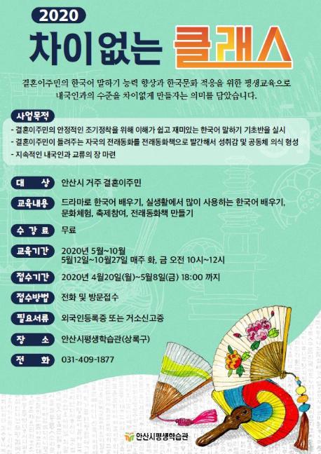안산시(시장 윤화섭) 평생학습관은 상록구 지역에 거주하는 결혼이주민을 대상으로 특수목적 한국어 교육 및 문화예술체험, 내국인과의 연계활동 프로그램인 ‘차이 없는 클래스’프로그램 수강생을 모집한다고 13일 밝혔다.