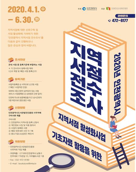 인천시(시장 박남춘)는 지역서점 활성화의 기반을 마련하고자 4월 1일부터 6월 30일까지 약 3개월에 걸쳐 인천광역시가 주최하고 인천광역시도서관발전진흥원 주관으로 2020년 인천광역시 지역서점 전수조사를 실시한다고 밝혔다.