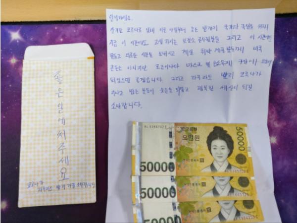 편지에는 “국가와 국민을 위해 지금 이 시간에도 고생하는 보건소 공무원들과 힘들고 외로운 시간을 보내고 있는 취약계층에게 마스크나 손소독제 구입에 도움이 됐으면 좋겠다”면서 “하루라도 빨리 코로나가 지나가 많은 분들이 웃음을 되찾고 행복한 세상이 되길 소망한다”는 내용이 적혀 있었다.