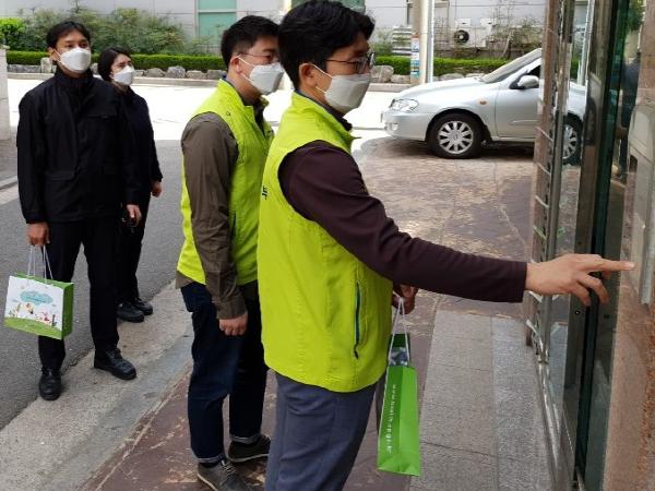 잠시 후 은평 관내에 자가격리중인 D씨가 나왔다. 구청 공무원은 반갑게 인사를 나누고 손소독제, 마스크, 살균제, 폐기물 봉투 등이 담긴 위생안심가방을 전달했다.