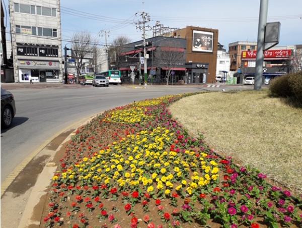 특히 올해는 코로나 19의 지역사회 감염 우려로 움츠러든 시민생활에 활력을 불어넣어주고 침체된 경제활동에 생명력을 전달기 위해 통행이 많은 회전교차로에 봄꽃으로 화단을 조성했다.