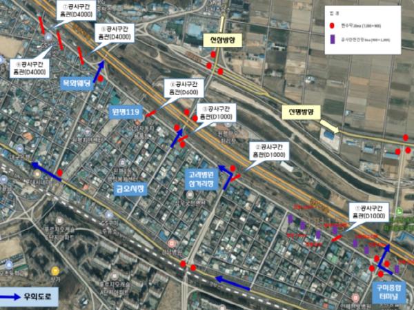 시민들의 불편을 최소화하기 위해 터미널네거리에서부터 순차적으로 7개구간에 걸쳐 주야간으로 관로횡단 매설작업 계획이다.