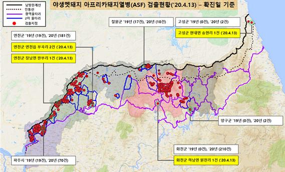 양성 폐사체를 지역별로 보면, 연천군 3건, 고성군 1건이며, 4월 11일 화천군 하남면 원천리에서 포획된 멧돼지 1건이 양성 확진되었다.