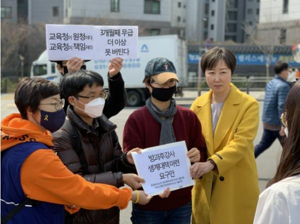 서울특별시 교육청은 코로나 19사태로 불가피하게 개학연기가 장기화 되면서 생활고를 겪는 방과후 강사들을 지원하기 위해 지속적인 노력을 했던 것으로 확인됐다. 그러나 대책마련 중 상위법 충돌이나 서울특별시의 코로나19 지원 대상 선정결정과 부딪히면서 사실상 지금까지 방과후 강사에 대한 대안을 내놓지 못하고 있는 실정이다.