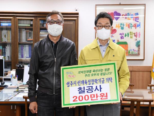경북 영주시인재육성장학회는 지난 14일 ‘코로나19’바이러스 확산 등으로 어려운 경제 여건 속에서도 칠공사(대표 박재훈)에서 200만원의 장학금을 기탁했다고 밝혔다.