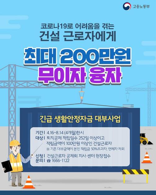 코로나19로 어려움을 겪는 건설 근로자에게 긴급 생활안정자금을 최대 200만원까지 무이자로 빌려줍니다.