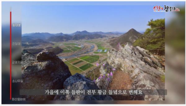 특히 이번 영상속에서 가장 눈여겨볼만한 포인트는 송대봉 정상에서 드넓게 펼쳐진 적성면 들녘을 바라보는 장면이다. 드넓은 평야가 펼쳐진 광활함이 보여주는 경치가 보는 이들로 하여금 마음의 평온를 느끼게 해준다.