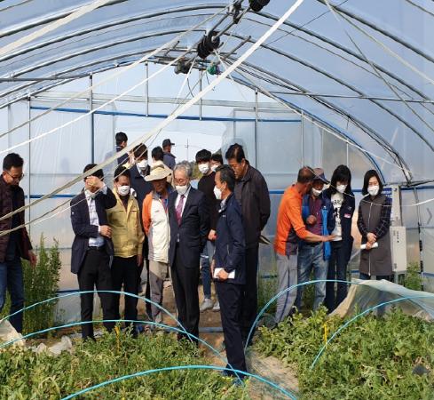 김준간 부군수를 비롯한 관계공무원, 수박생산자협의회, 시설원예연구소 등이 참석한 이번 평가회는 시설원예연구소에서 시범사업의 하나로 추진했던 수박 고정식 하우스를 설치한 농가의 추진상황 평가를 위해 마련됐다.