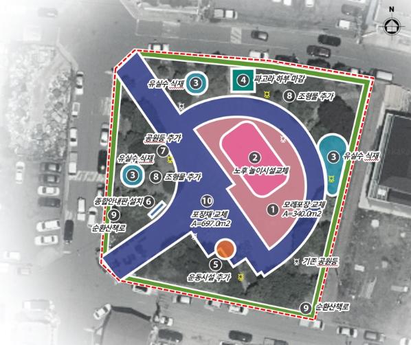 놀이터에는 조합놀이대 1개, 그네 2개, 운동시설 2세트, 투수블럭포장 733㎡, 탄성고무칩 544㎡, 파고라 1개 등이 설치된다.