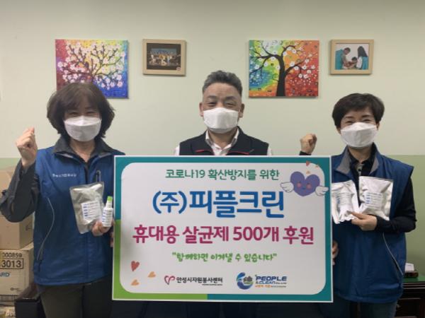 지난 13일 ㈜피플크린(대표 장문희)는 코로나 19 확산방지를 위해 휴대용 살균제 500개를 안성시자원봉사센터(센터장 이진석)에 전달했다.