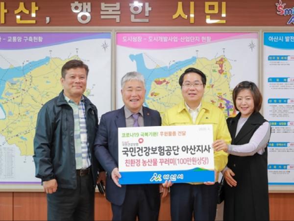 이날 전달된 후원물품은 국민건강보험공단 아산지사 임직원이 코로나19 극복 기원에 동참하고자 자발적으로 십시일반 모아 마련한 후원금으로 마련됐다.