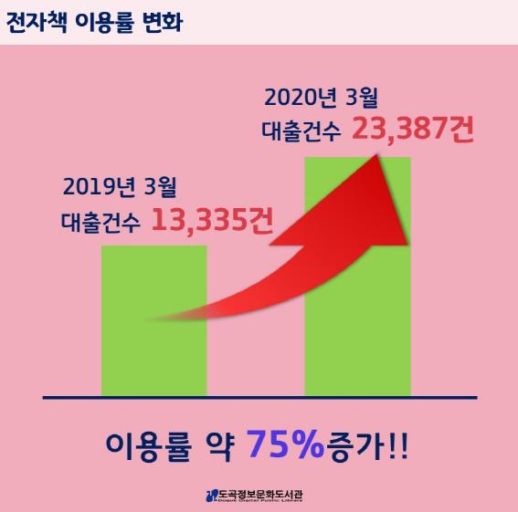 ‘기분 좋은 변화, 품격 있는 강남’을 구현 중인 강남구(구청장 정순균)가 구립도서관 임시휴관 기간 중 온라인 독서활동을 장려한 결과, 3월 한 달간 전자도서관 이용률이 지난해보다 75% 증가한 것으로 나타났다.