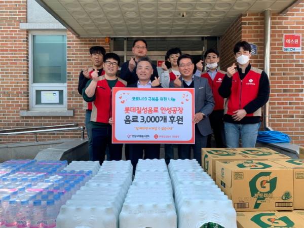 롯데칠성음료㈜ 안성공장은 지난 16일, 지역사회의 코로나19 바이러스 감염 예방에 힘쓰는 방역소독 자원봉사자들을 위해 음료 3,000개를 안성시자원봉사센터에 전달했다.
