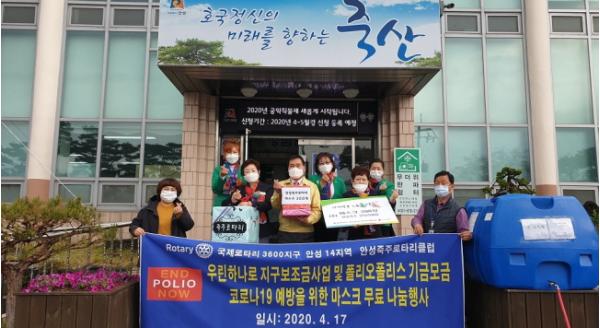 안성죽주로타리클럽이 17일, 죽산면사무소를 방문해 코로나19 극복을 위해 마스크 200장을 전달했다.