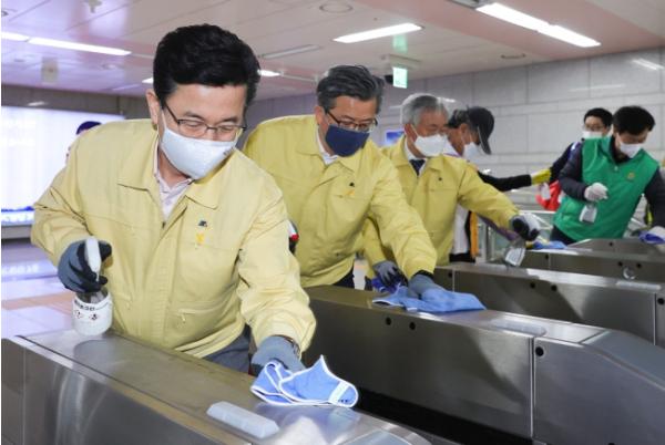 허태정 대전시장은 이 날 유성온천 인근에서 펼쳐진 환경 정화활동에 참여해 유성온천역 내부 소독과 충남대 입구로 이어지는 가로변 환경정비 활동을 함께했다.