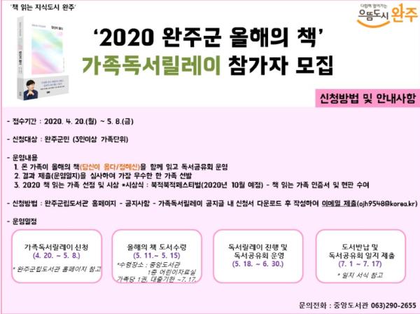 참여를 원하는 가족은 완주군립도서관 홈페이지에 접속해 신청서를 다운받아 이메일(ojh9548@korea.kr)로 제출 후, 중앙도서관 1층 어린이자료실에서 책을 수령해가면 된다.