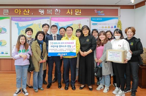 한국부인회 아산시지회(회장 김혜정), 나눔터 봉사단(대표 이은성), 교육공동체협동조합 노리아이(이사장 이명희)는 4월 16일 아산시에 코로나19 극복 기원과 아산시 관내 다문화가정과 저소득층 외국인 자녀들을 위한 오가닉 면 마스크 500장을 전달했다.