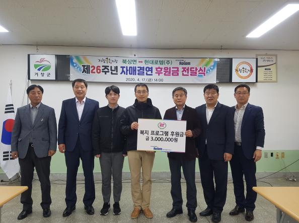 거창군 북상면(면장 김장웅)은 지난 17일 북상면 회의실에서 자매결연기업인 창원 소재 현대로템(주) 임직원이 방문해, 임종호 주민자치회장, 김종두 거창군의회 의원, 이장자율협의회장 등이 참석한 가운데 후원금 전달식을 가졌다.
