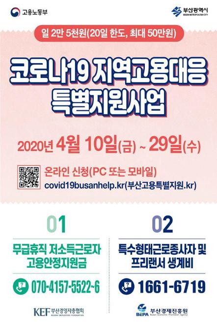 신청방법은 ‘사회적 거리두기’ 실천을 위하여 4월 10일부터 4월 29일까지 전용 홈페이지(www.covid19busanhelp.kr / 부산특별고용지원.kr) 통해 비대면 온라인으로 접수하며, 신청자격 및 제출서류는 ‘공고 및 Q&A’에서 확인하면 된다.
