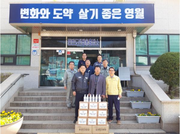 2020년 4월 14일(화) 쌍용양회 영월공장 협력업체(10개)일동은 코로나19 예방을 위하여 쌍용후탄지역 10개리 마을 및 경로당에 손세정제 60병을 전달함으로써 지역주민들로부터 큰 호응을 얻고 있다.