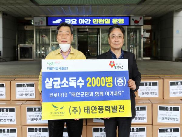 군에 따르면, ㈜태안해상풍력(대표 추병원)이 지난 17일 군청 현관에서 가세로 군수, 회사 관계자 등이 모인 가운데 기탁식을 갖고 의료 취약계층을 위해 써달라며 살균소독수 2천병(2천만 원 상당)을 군에 전달했다.