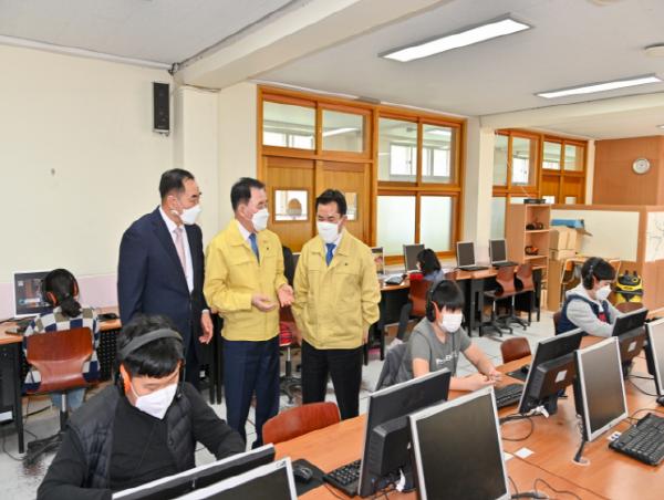 박정현 부여군수는 지난 16일 온라인 개학에 따라 원격수업이 진행된 부여초등학교를 방문하여 온라인 원격수업을 참관하고 교사와 교직원 등을 격려했다.