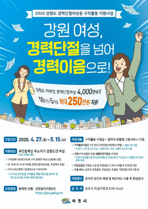 속초시는 경력단절여성의 취업지원 사각지대 해소 및 경제활동 참여율 제고를 위하여 「2020 강원도 경력단절여성등 구직활동 지원사업」 대상자를 2020. 4. 27(월) ~ 5. 15(금)까지 신청·접수한다.