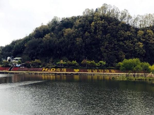 탐진강변 제방 경사면에는 영산홍과 황금사철나무를 이용하여 물축제 홍보문구를 토피어리 형식으로 식재해 볼거리도 추가했다.