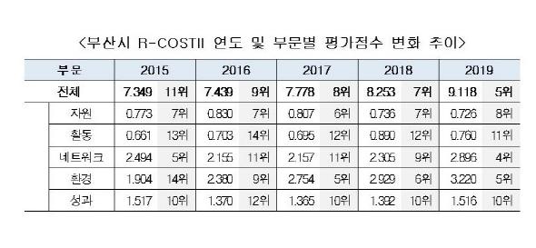 부산시(시장 오거돈)는 한국과학기술기획평가원(이하 KISTEP)이 지난 3월 27일 발표한 ‘2019년 지역과학기술혁신 역량평가’에서 부산의 지역과학기술혁신역량지수(이하 R-COSTII*)가 전국 5위로 전년 대비 2단계 상승했다고 밝혔다.