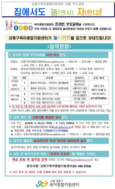 이정훈 강동구청장은 “가정보육이 길어지고 있는 현 시점에서 온라인 부모교육을 통해 부모는 건강한 양육관을 형성하고 집에서 아이와 함께 놀이를 즐기면서 코로나19로 인한 일상 속 무료함을 슬기롭게 극복해 나가길 바란다”라고 전했다.