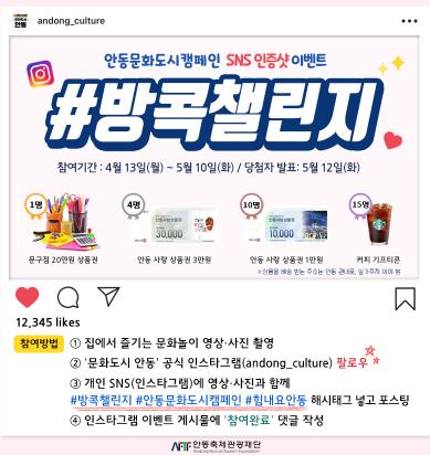 (재)안동축제관광재단은 문화특화지역 조성사업의 하나로 문화도시 캠페인사업과 연계한 ‘방콕챌린지’이벤트를 5월 10일까지 진행한다.