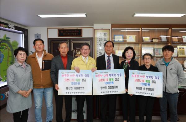 지난 20일 용산면이장협의회(협의회장 조규군), 양산면이장협의회(협의회장 임구호), 심천면이장협의회(협의회장 배정애)가 영동군청을 찾아 소속 이장들의 정성으로 십시일반 모은 성금 각100만원씩을 ‘레인보우 행복나눔’에 기탁했다.