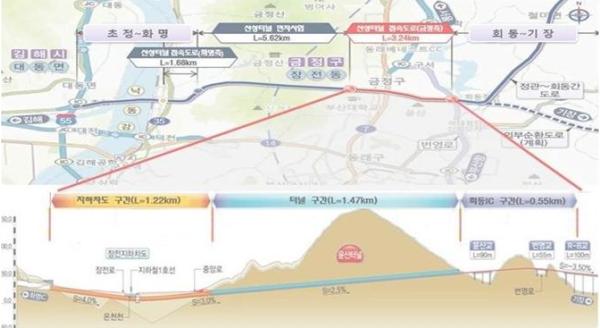 이날 접속도로 개통으로 산성터널 금정측 구간은 지난 2013년 8월에 착공한 이래, 6년 8개월 만에 온전한 모습을 선보인다. 이번에 개통한 구간은 금정구 산성터널 금정측 입구와 회동IC를 잇는 총연장 3.24km의 왕복 4~6차로로 총사업비는 3,308억 원(시비 1,978억 원, 국비 1,330억 원)에 달한다. 제한속도는 80km로 금정구 장전초교~윤산 입구까지는 지하차도(1.22km)이며 윤산구간은 터널과 교량 등(2.02km)으로 구성되어 있다.