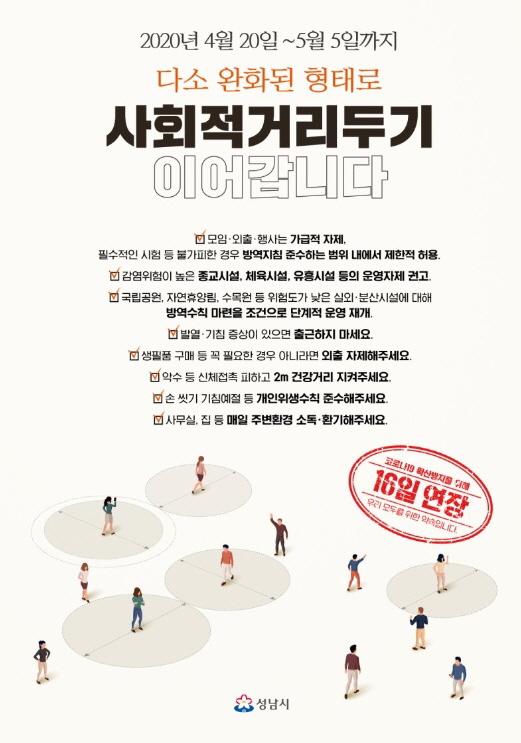 성남시재난안전대책본부는 20일 시장 주재로 ‘코로나19 관련 대책회의’를 열어 4월 20일부터 5월 5일까지 16일간 사회적거리두기 기간을 연장한다는 정부방침을 따르기로 하고, 이에 후속 방역 조치를 마련했다.