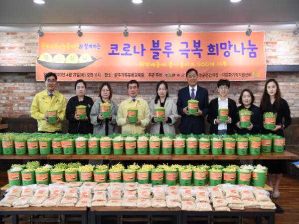 21일 완주군건강가정·다문화가족지원센터 소속 완주가족나눔봉사단(단장 정소연) 회원 50가족이 콩나물 키우기 키트와 응원 손 편지를 이웃에게 전달했다.
