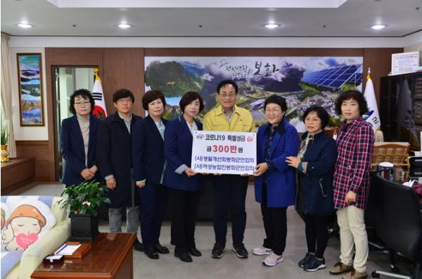 봉화군(군수 엄태항)은 4월 20일 (사)생활개선회 봉화군연합회(회장 김옥랑), (사)여성농업인 봉화군연합회(회장 우해월)에서 봉화군청을 방문하여 코로나19 극복을 위한 특별성금 300만원을 기탁했다고 밝혔다.