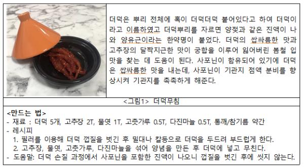 농촌진흥청 국립원예특작과학원 김동휘 인삼특작이용팀장은 “춘곤증을 겪는 봄철에 더덕, 쑥, 갯기름나물 등 쉽게 구할 수 있는 약초로 잃어버린 입맛을 찾고 활력을 채우길 바란다.”라고 전했다.