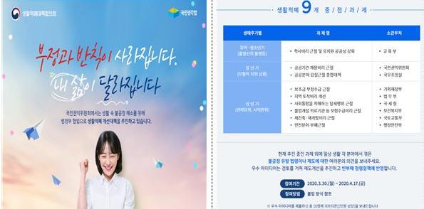공모 내용은 생활 속 공정성 강화를 위해 정부가 현재 생애주기별로 추진 중인 9개 생활적폐 과제를 포함해 국민이 일상생활 속에서 겪는 각종 반칙과 부조리를 유발하는 법령과 제도이다.