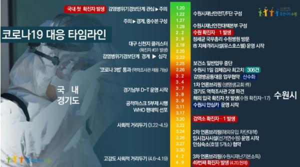 2월 2일, 수원시에 첫 확진환자가 발생했다. 중국 우한에서 입국한 40대 남성이었다. 수원시는 긴급대책회의를 소집하고 위기 경보단계 중 가장 높은 수준인 ‘심각’ 단계에 준하는 대응을 하기로 했다. 관내 모든 어린이집에 2월 3일부터 임시 휴원 명령을 내리고, 수원시 공공시설, 모든 동의 주민자치센터 프로그램 운영을 전면 중단했다.