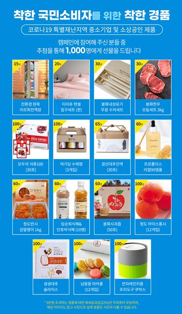 캠페인에 참여한 일반 국민 약 1,000여명을 선정하여 코로나19 특별재난지역 소상공인 제품, 지역 특산품 등을 구매하여 경품으로 지급할 예정이다.