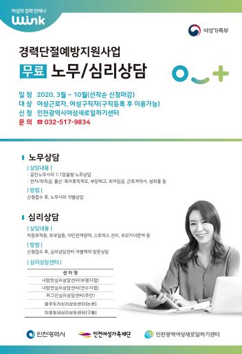 인천광역여성새로일하기센터(인천광역새일센터)에서는 여성의 경력단절을 예방하기 위한 사업으로 여성을 위한 노무상담 및 심리상담 컨설팅을 지원한다.