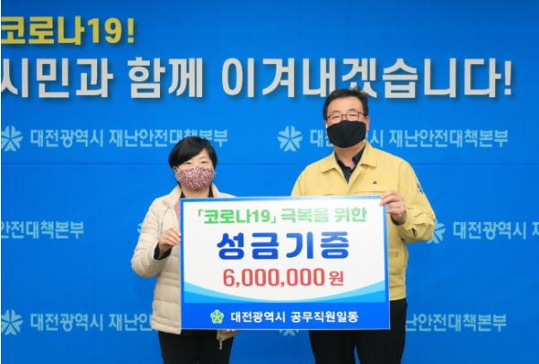 대전시에 근무하는 공무직원들이 23일 코로나19 극복을 위해 자발적으로 모금한 성금 600만 원을 대전시에 기탁했다.