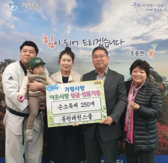 가평군 동원태권스쿨(관장 동상운)는 지난 21일 조종면행정복지센터(면장 박재근)를 찾아 취약계층을 위한 휴대용 손소독제 250개를 기탁하였다.