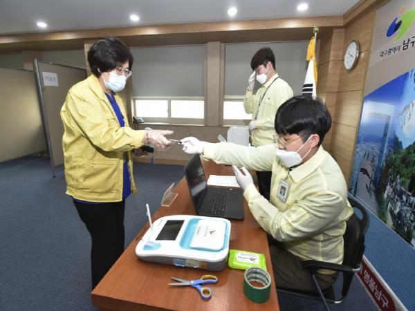 대구광역시 남구청(구청장 조재구)에서는 지난달 31일, 코로나19로 인한 투표관리대책에 따라 유권자들의 원활한 투표참여 환경을 조성하고 코로나19에 대응하는 투표사무원들의 역할 점검을 위해 제21대 국회의원 선거 투표사무 시범운영을 실시했다.